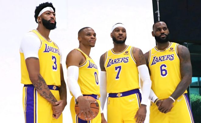 2021年身为卫冕冠军的湖人,他们首轮就惨遭被太阳淘汰,詹姆斯和浓眉的伤病让管理层意识到了是时候给他们找来分担压力的帮手了,于是休赛期湖人送出库兹马、波普等筹码换来了三双王威少,并在自由市场上签下了安东尼、隆多、霍华德,只看阵容的线名球员都具备入选名人堂的资格,因此就连他们自己都知道这套阵容不夺冠就是失败。